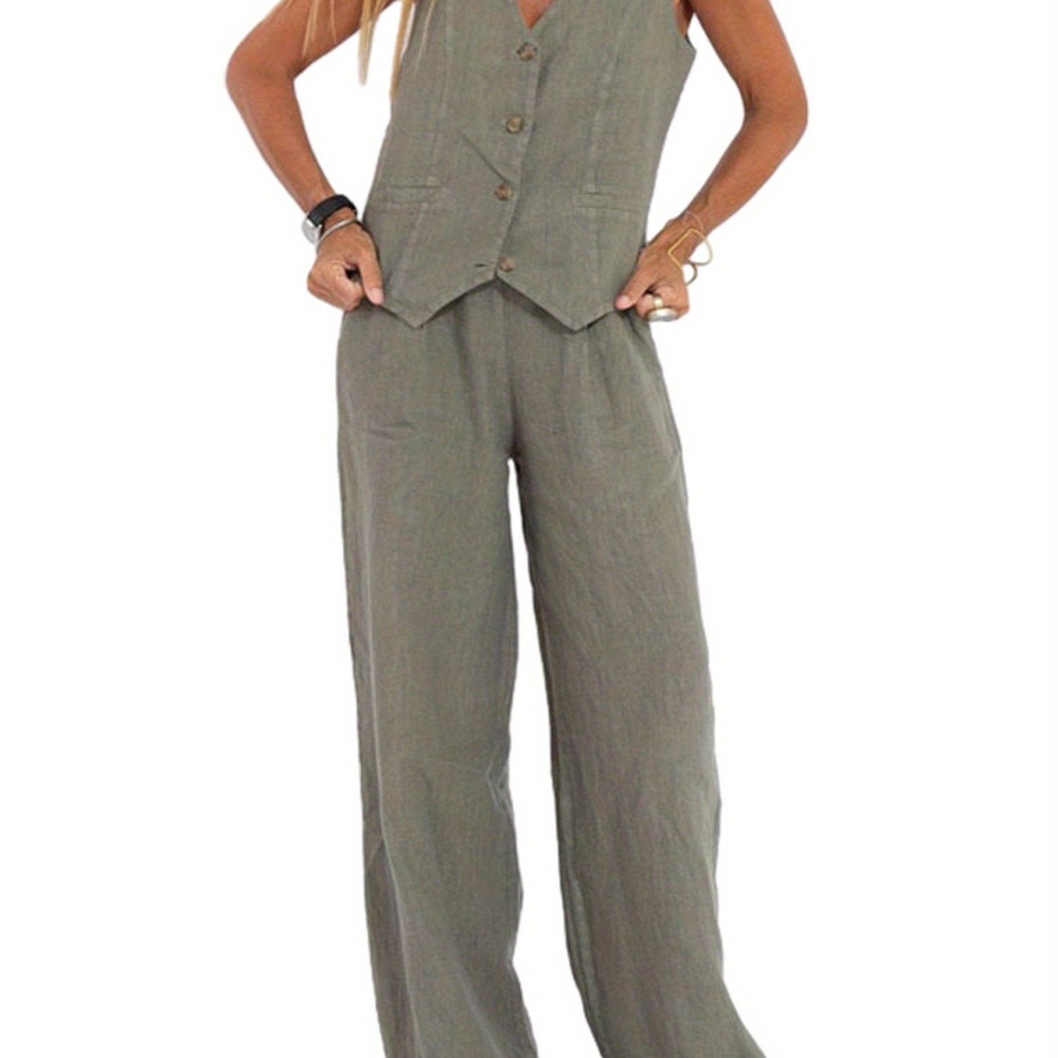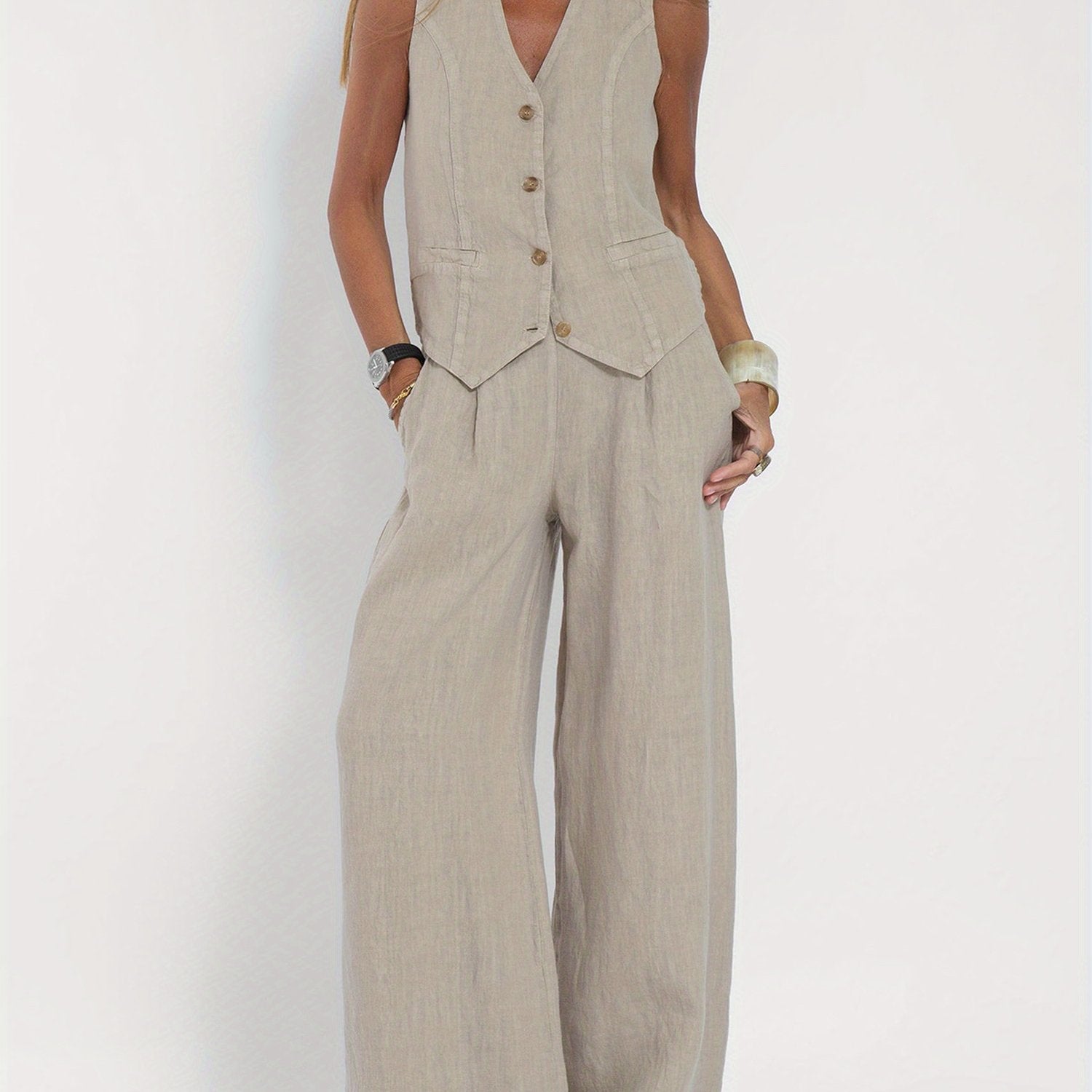 The Calerra Vest & Wide-Leg Set is your answer to effortless sophistication. With a structured button-up vest and flowy wide-leg trousers, this set merges tailored charm with all-day comfort. Its soft polyester-cotton blend offers lightweight breathability and a flattering drape, no matter the season.