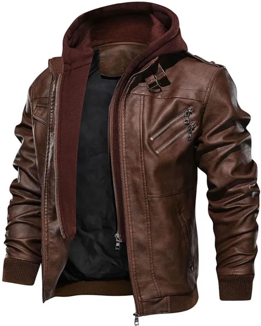 The Holden Military Hooded Jacket combines the toughness of a biker jacket with the laid-back comfort of a hoodie. Built with a sleek faux leather shell, ribbed cuffs and hem, and a removable cotton hood insert, it delivers a versatile style you can wear across seasons. Multiple zippered pockets add utility and edge, while the slim cut and textured finish make it a standout layer for nights out or casual days.
