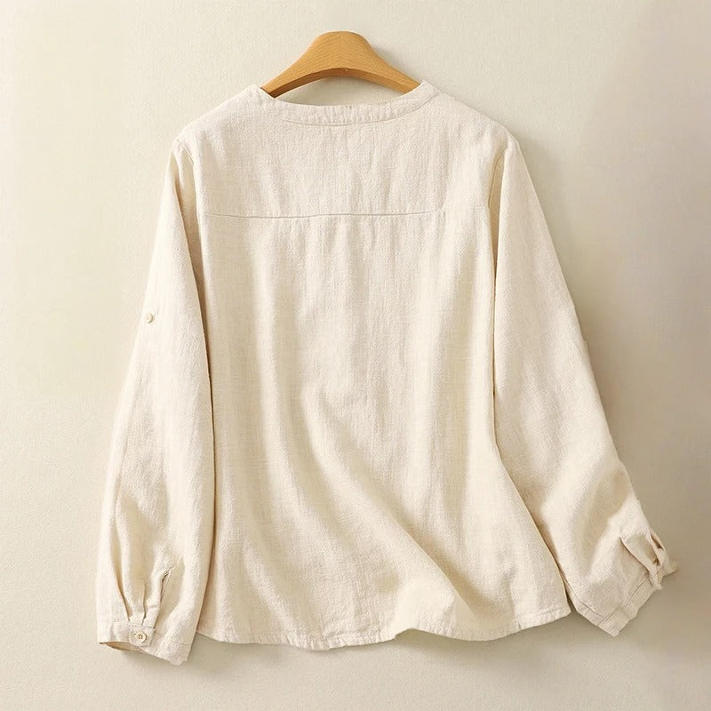 The Mae Linen Blouse combines quiet structure with soft, minimalist elegance. Cut from breathable gossamer linen, it features a rounded collar, chest pocket, and rollable sleeves, making it your go-to for both mindful mornings and days in motion.